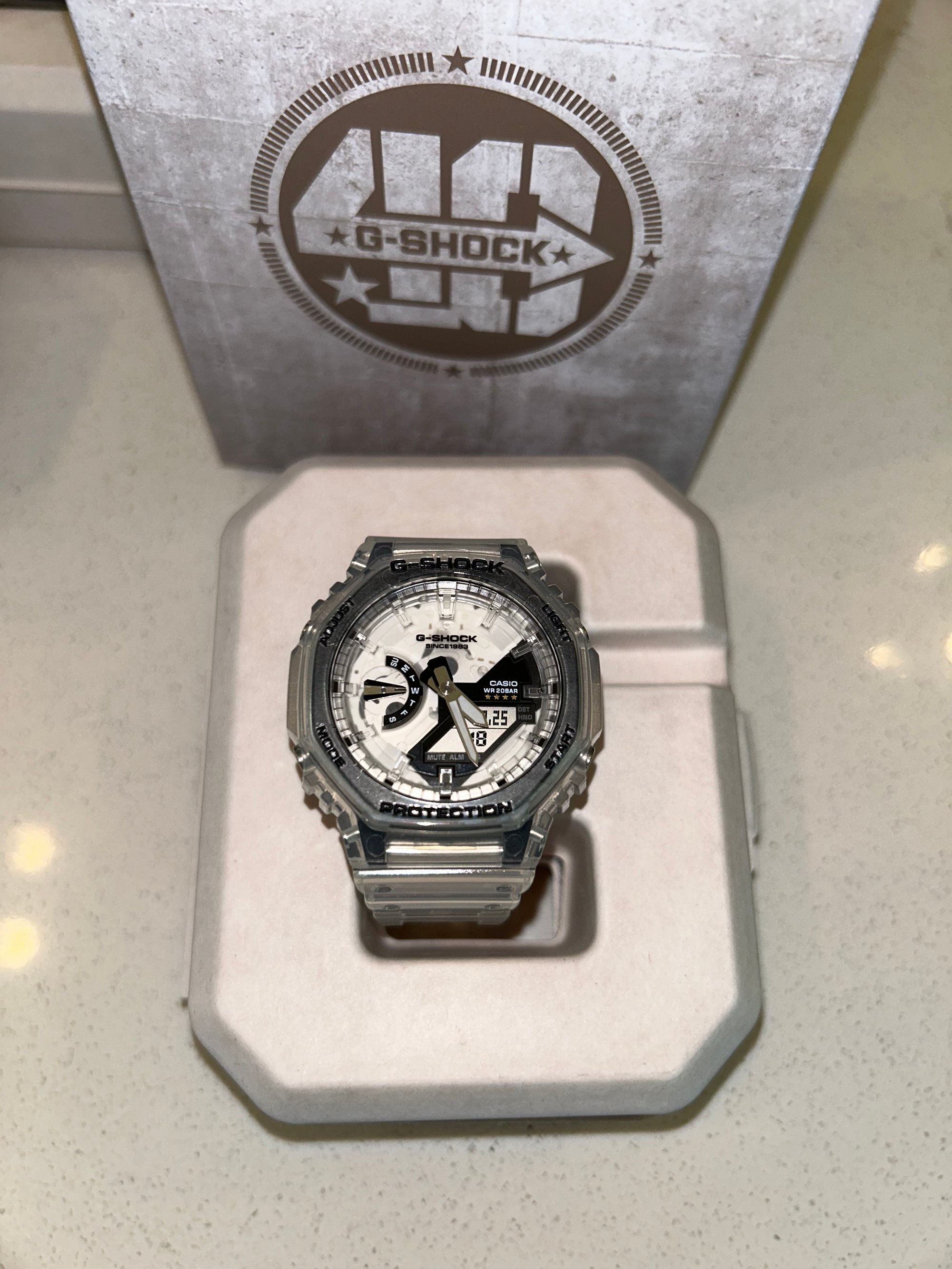 See-through materials for the band, case, dial, LCD, and buttons provide a behind-the-scenes view of the module substrate printed with the G mark and G-SHOCK logo. The case back features the Eric Haze-designed 40th logo, and the band loop is engraved with four stars in a nod to this special anniversary. These details and the first-ever use of a see-through case made of clear glass fiber diamide deliver a singular design worthy of an exceptional limited-edition G-SHOCK.